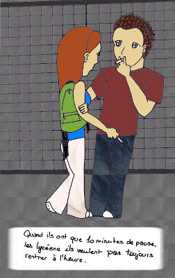De plus, j'ai tendance à dire que, pour nous filer une pause déjeuner de 1h25 (alors que 55 minutes c'était amplement suffisant), pour pouvoir "manger dehors" (alors que le truc le plus proche est à 1h3o de marche aller-retour, cherchez l'erreur), ils nous ont enlevé 5 minutes de récré (donc on doit aller fumer en 2 4 6 et c'est inadmissible déjà), et maintenant on finit plus à 18h1o, mais à 18h3o. Alors que la plupart des lycéens mettent au moins une heure à rentrer chez eux, si ce n'est plus. Oui, dans mon lycée les représentants du CVL de l'année dernière ont fumé un baobab. Pasque c'est bien joli de dire qu'on met du temps à passer à la cantine, mais si la grosse connasse qui nous sert de proviseur faisait mieux les emplois du temps, le problème ne se poserait même pas. Et toc !